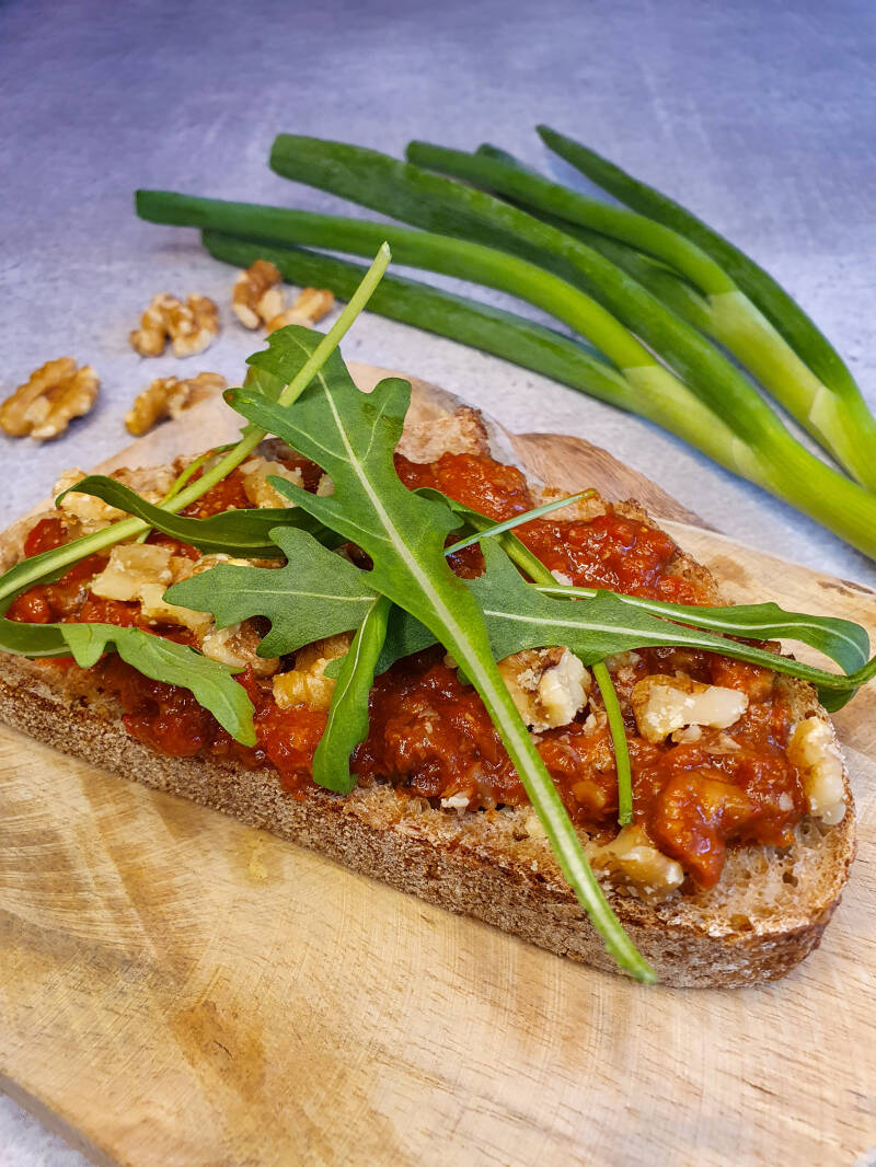Verwarm de oven voor op 200 graden. Snijd de paprika's in 4'en en verwijder de zaadlijsten. Wikkel de knoflook in aluminiumfolie en rooster deze met de paprika's ca. 20 minuten in de oven. Hak ondertussen de walnoten fijn. Ontvel de paprika's door ze in koud water te laten schrikken. Meng de paprika's met knoflook, paprikapoeder, olijfolie, komijn, granaatappelmelisse, limoensap en cayennepeper in de keukenmachine en breng op smaak met peper en zout. Roer de walnoten erdoor (hou er een paar achter voor de garnering). Smeer de muhamarra op een broodje en maak af met wat walnoten en rucola.