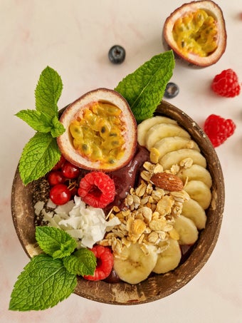 Doe de açai met de bevroren bananen in de blender en blend tot een gladde massa. Giet de massa in 2 kommen en garneer met een halve passievrucht, plakjes banaan, frambozen, bessen, kokossnippers, chiazaad, muesli en verse munt. Serveer direct.