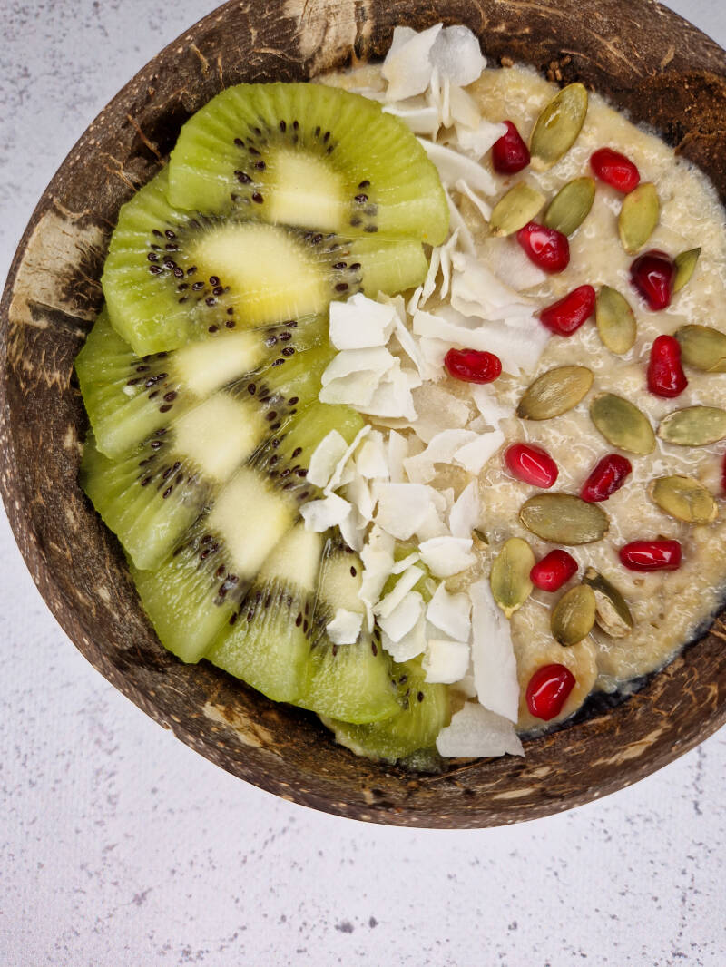 Verdeel de pap over 2 kommen en serveer met kiwi, kokos, granaatappelpitjes en pompoenpitten.