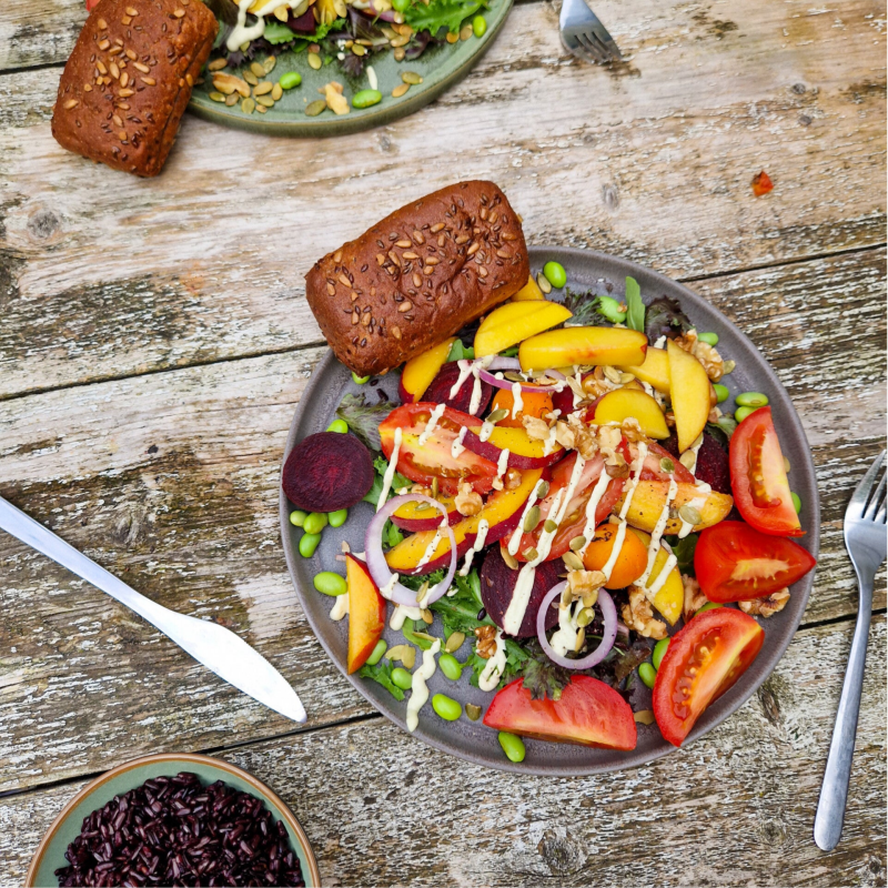 Heb je wel eens van zwarte rijst gehoord? Naast dat het er tof uitziet, is het ook voedzaam! De tomaatjes in dit gerecht ontvellen we met een brander, hierdoor krijg je een super lekker rokerig smaakje en dat combineert weer super met het zoete van de perzik en biet. De walnoten en pompoenpitten zorgen voor een lekkere bite en de pestomayo is de finishing touch!